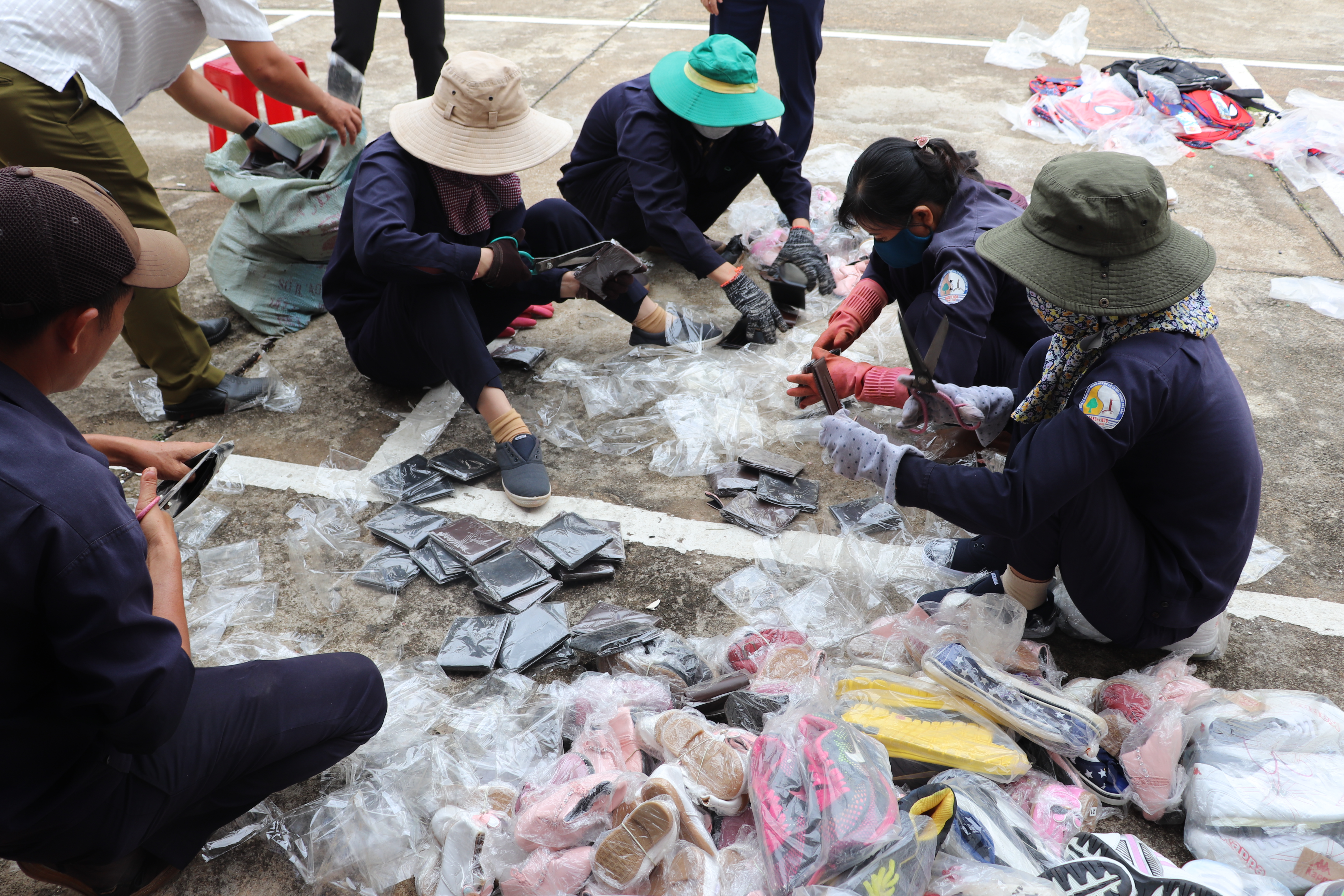 | Hàng hóa là giày dép, ví tiền... được tiêu hủy bằng hình thức sử dụng biện pháp tác động cơ học phá vỡ kết cấu sau đó chôn lấp tại bãi rác |