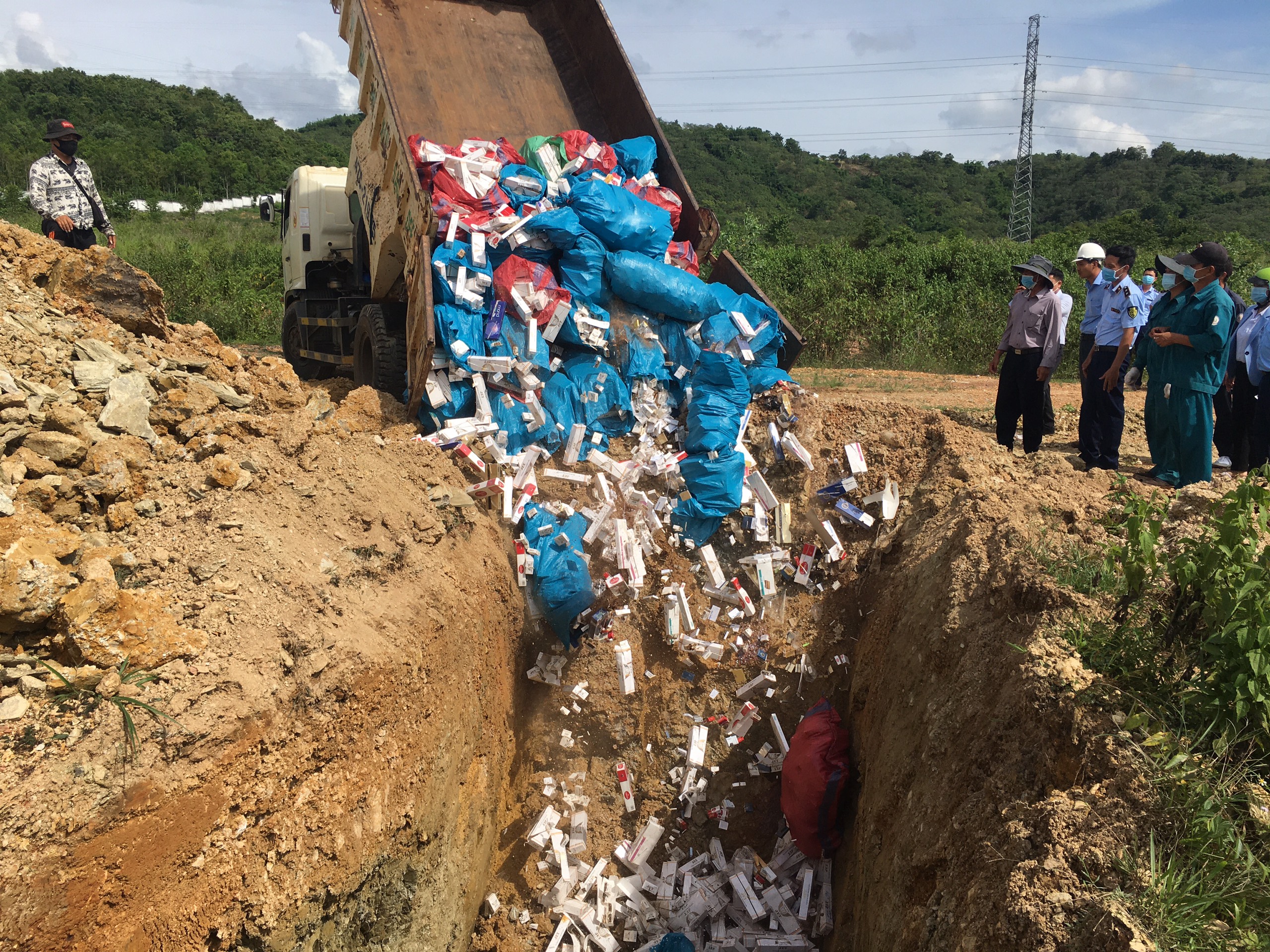 | 25.385 bao thuốc lá điếu ngoại nhập lậu được tiêu hủy bằng hình thức dùng máy cắt, xả nước, sau đó chôn lấp tại bãi rác |