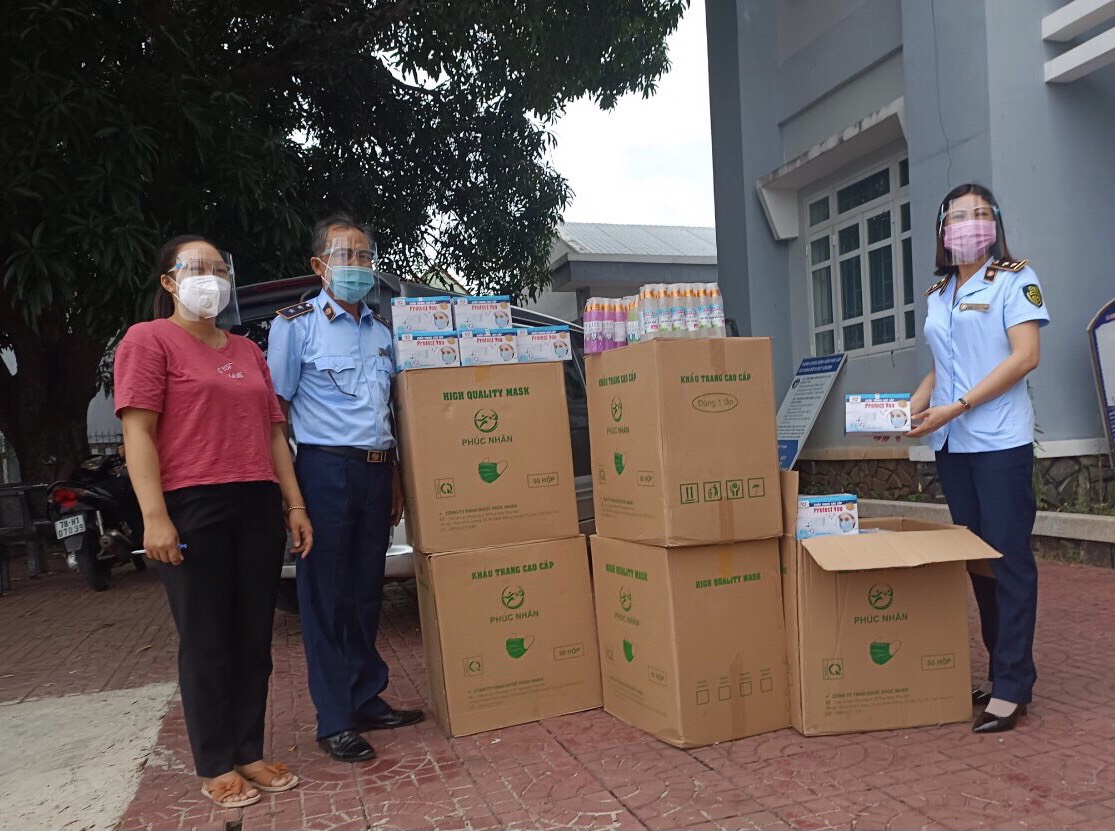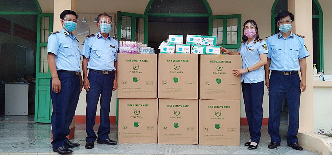 Đội Quản lý thị trường số 4 - Cục Quản lý thị trường Phú Yên tặng khẩu trang y tế và nước sát khuẩn cho Uỷ ban nhân dân huyện Tuy An, tỉnh Phú Yên.