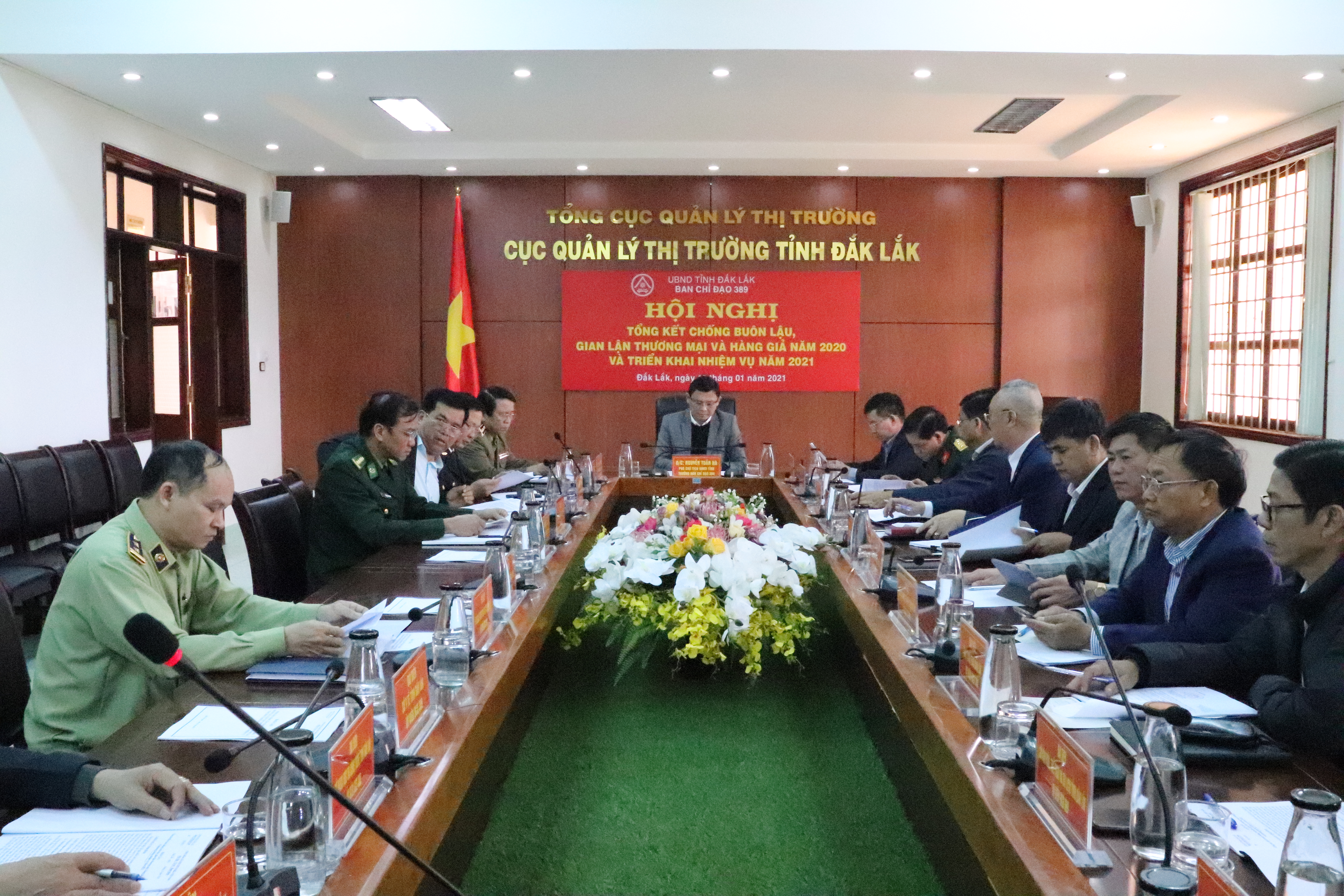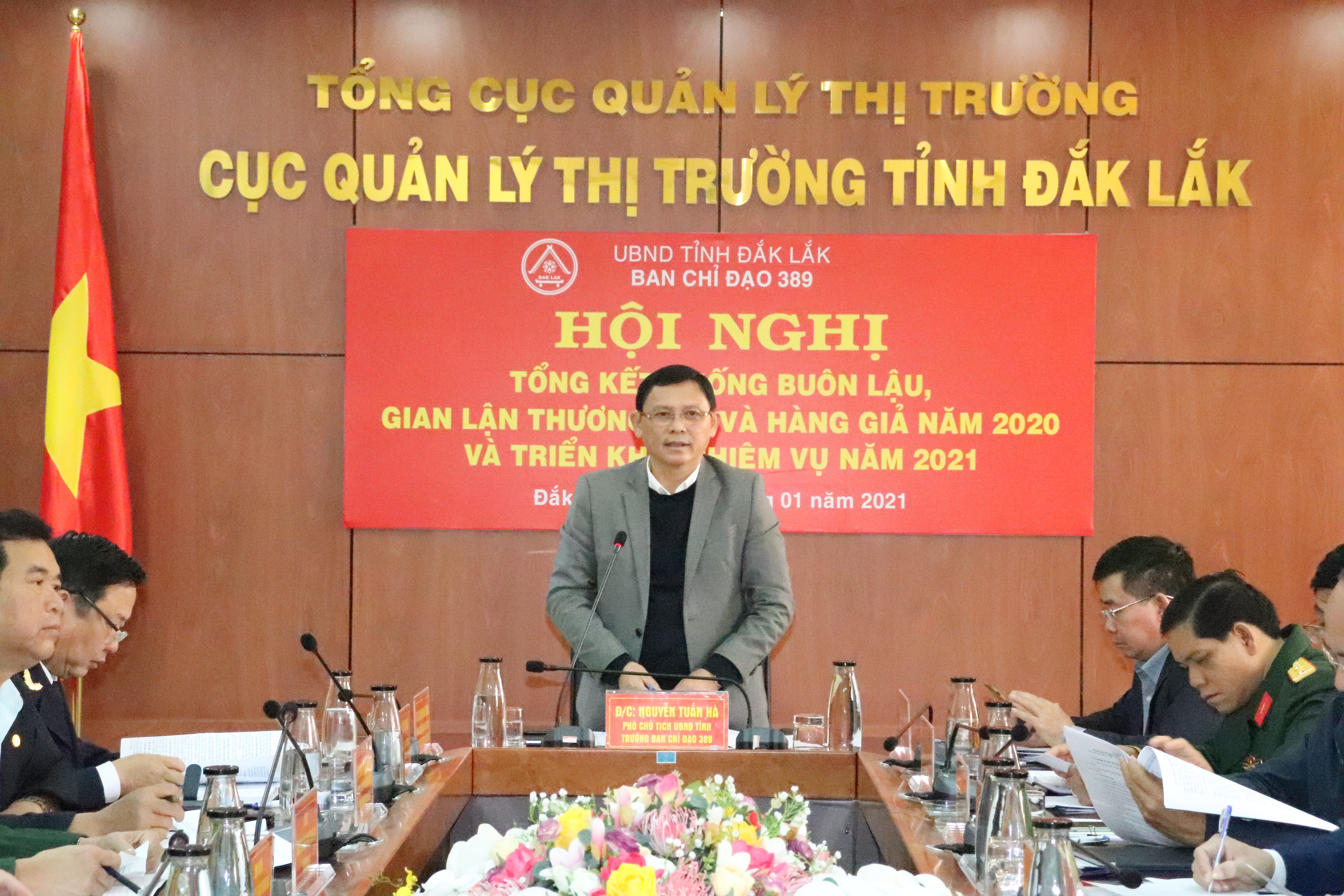 Chiều ngày 13/01/2021, tại trụ sở Cục Quản lý thị trường tỉnh Đắk Lắk, Ban Chỉ đạo 389 tỉnh Đắk Lắk đã tiến hành họp tổng kết công tác đấu tranh chống buôn lậu, gian lận thương mại, hàng giả năm 2020 và triển khai phương hướng, nhiệm vụ năm 2021. Đồng chí Nguyễn Tuấn Hà - Phó Chủ tịch thường trực UBND tỉnh, Trưởng ban Chỉ đạo 389 tỉnh chủ trì Hội nghị. Tham dự Hội nghị có đại diện của các sở, ban, ngành trên địa bàn tỉnh là thành viên của Ban Chỉ đạo 389 và phóng viên các cơ quan báo chí.