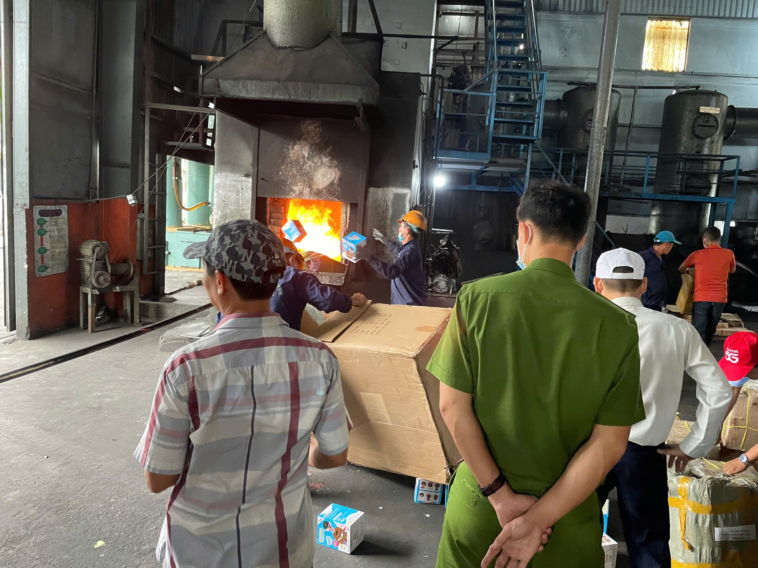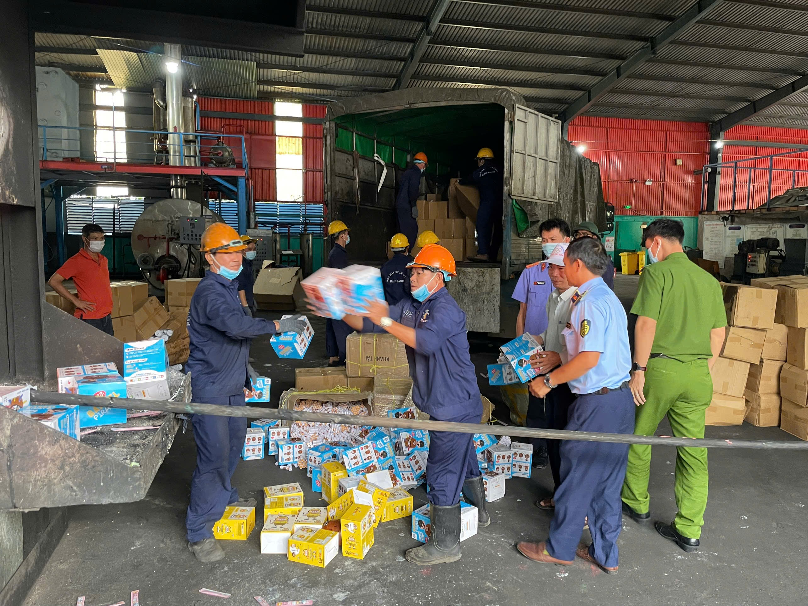 Tiếp đó ngày 03/12/2024, tại Nhà máy tái chế và xử lý chất thải nguy hại (xã Cát Nhơn, huyện Phù Cát, tỉnh Bình Định) - Công ty TNHH Thương mại và Môi trường Hậu Sanh (đơn vị được thuê thực hiện việc tiêu hủy) đã tiến hành tiêu hủy tất cả số hàng hóa là tang vật vi phạm hành chính bị tịch thu trên dưới sự giám sát của Hội đồng kiểm kê, tiêu hủy và các cơ quan ban, ngành chức năng, tổng giá trị hàng hóa trên 3,2 tỷ đồng. Hàng hóa tiêu hủy gồm 95 mặt hàng hóa là những hàng không rõ nguồn gốc xuất xứ, không dán tem, không đảm bảo an toàn thực phẩm theo quy định, hàng nhập lậu, không có số công bố sản phẩm, không đảm bảo chất lượng, không đủ điều kiện lưu hành trên thị trường đã bị tịch thu.