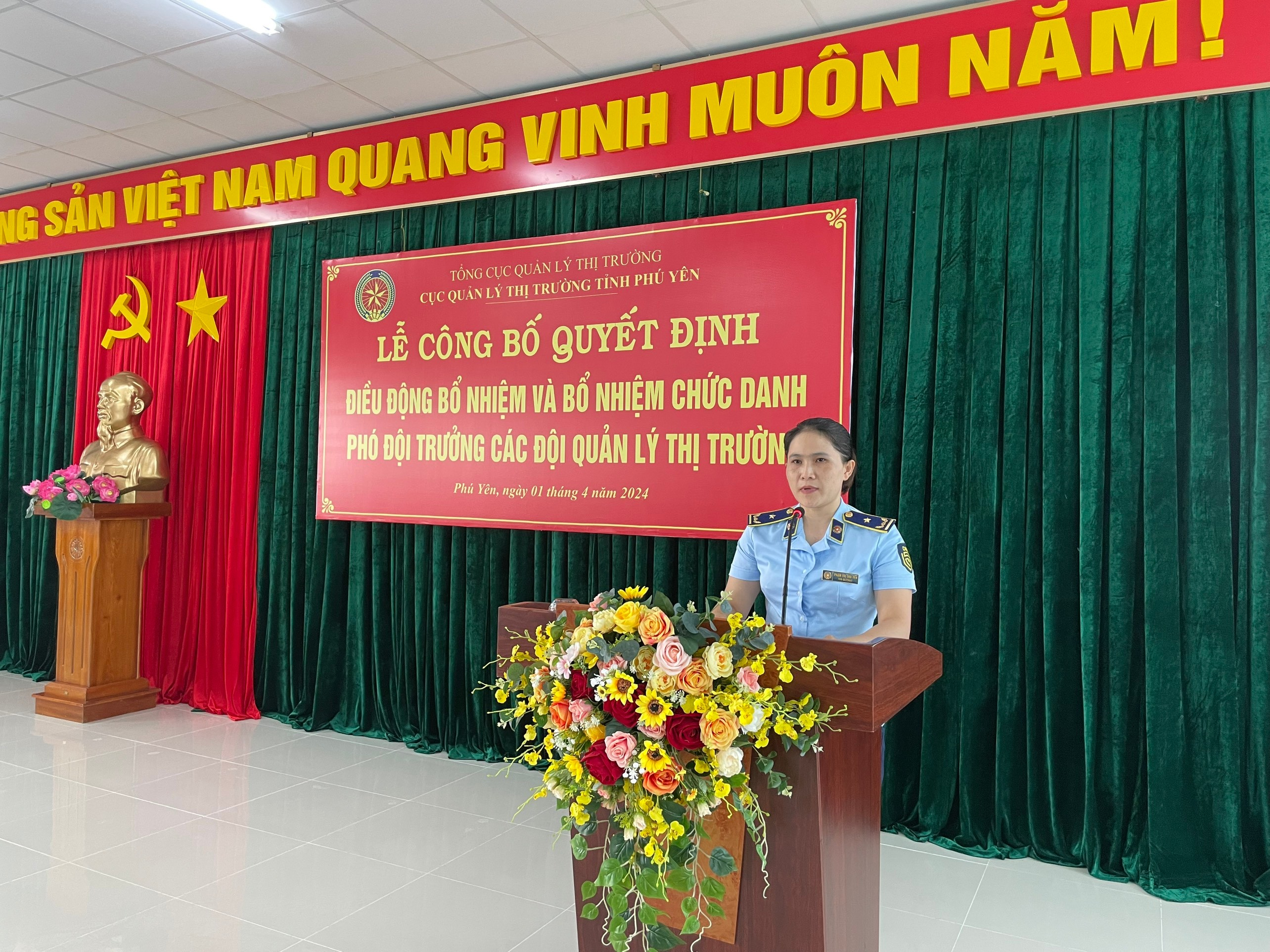 Phát biểu tại buổi lễ, đồng chí Huỳnh Trang, Cục trưởng Cục QLTT Phú Yên đề nghị các đồng chí được bổ nhiệm tiếp tục tu dưỡng, rèn luyện, nâng cao bản lĩnh chính trị, phát huy hơn nữa tinh thần trách nhiệm, năng lực và kinh nghiệm trong công tác lãnh đạo, quản lý, góp sức cùng tập thể Cục Quản lý thị trường Phú Yên đoàn kết, vững mạnh và thực hiện tốt nhiệm vụ được giao.