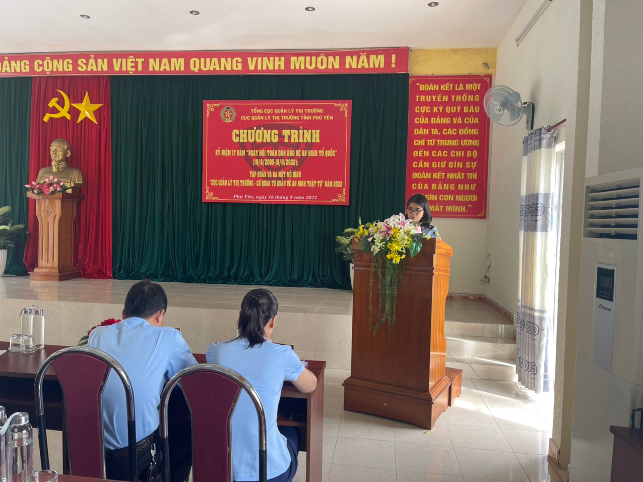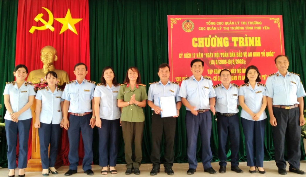 Sáng ngày 16/8/2022, Cục Quản lý thị trường tỉnh Phú Yên tổ chức chương trình kỷ niệm 17 năm “Ngày hội toàn dân bảo vệ an ninh Tổ quốc” (19/8/2005-19/8/2022) và ra mắt, triển khai tập huấn mô hình “Cục Quản lý thị trường – Cơ quan tự quản về An ninh trật tự”. Dự hội nghị có đồng chí Trung tá Nguyễn Thị Mai Hương – Phó trưởng Phòng PV05 – Công an tỉnh, đồng chí Trung tá Lê Tấn Tình, Trưởng Công an Phường 7 và các đồng chí Lãnh đạo cục, Lãnh đạo các Phòng chuyên môn, lãnh đạo các Đội trực thuộc Cục Quản lý thị trường.