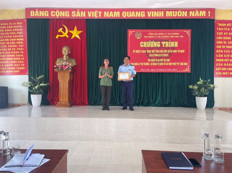 Nhằm ghi nhận những thành tích đạt được của Cục QLTT Phú Yên trong hoạt động “Ngày hội toàn dân bảo vệ an ninh Tổ quốc”, tại buổi kỷ niệm đồng chí Trung tá Nguyễn Thị Mai Hương – Phó trưởng phòng PV05, Công an tỉnh thay mặt Giám đốc Công an tỉnh lên trao tặng giấy khen cho Cục QLTT Phú Yên