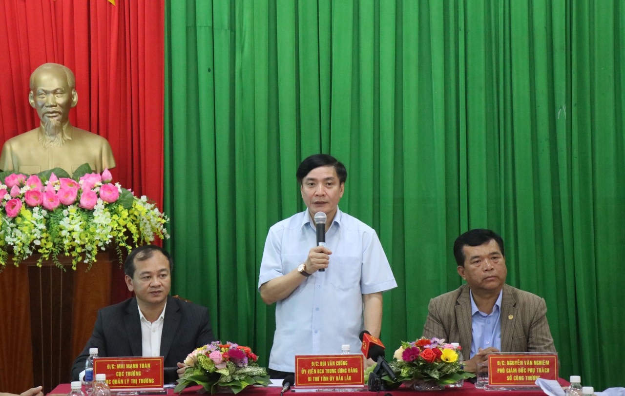 Phát biểu chỉ đạo tại buổi làm việc, đồng chí Bùi Văn Cường - Ủy viên Ban chấp hành Trung ương Đảng, Bí thư Tỉnh ủy Đắk Lắk chia sẻ với những khó khăn mà Cục Quản lý thị trường tỉnh Đắk Lắk đã và đang gặp phải. Đồng chí cũng biểu dương những kết quả tích cực mà đơn vị đã đạt được trong thời gian qua trong công tác kiểm tra, kiểm soát thị trường và nhất trí với những kiến nghị, đề xuất của đơn vị về việc quan tâm xây dựng cơ sở vật chất, mua sắm trang thiết bị phục vụ công tác kiểm tra, kiểm soát thị trường. Bên cạnh đó, Cục Quản lý thị trường cần có những đề xuất, kiến nghị với Hội đồng nhân dân tỉnh hoặc những cơ quan lập pháp cao hơn để hoàn thiện các quy định của pháp luật, khắc phục tình trạng các văn bản pháp luật chồng chéo, mâu thuẫn, gây khó khăn cho công tác kiểm tra, xử lý của ngành.