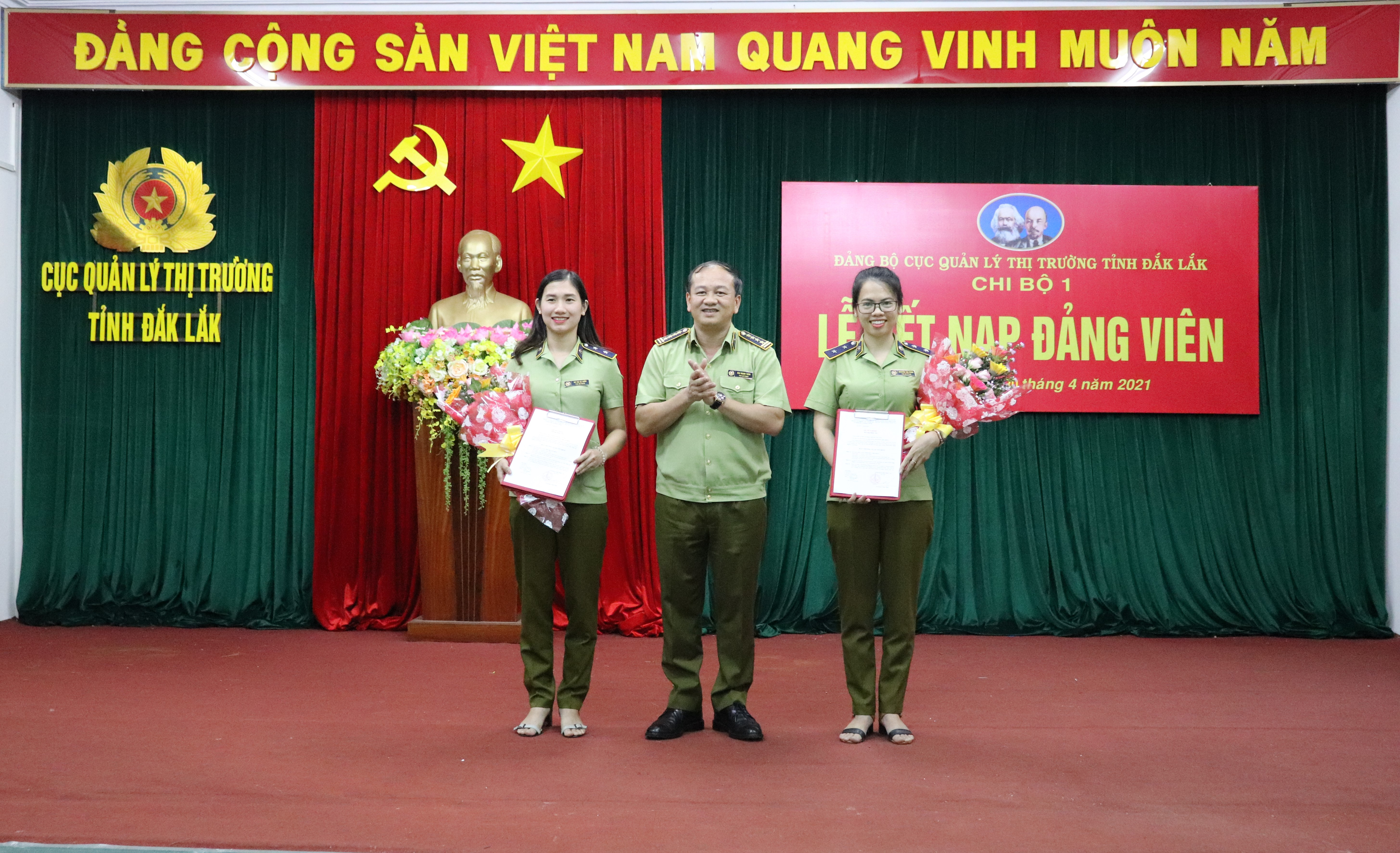 Được sự đồng ý của Đảng ủy khối các cơ quan và doanh nghiệp tỉnh Đắk Lắk cũng như Đảng ủy Cục Quản lý thị trường, ngày 30/4/2021, Chi bộ 1 thuộc Đảng ủy Cục Quản lý thị trường đã tổ chức Lễ kết nạp đảng viên mới cho hai quần chúng ưu tú là Võ Thị Lệ Thủy và Nguyễn Thị Phúc.